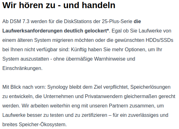 Ich glaube zwar nicht, dass es ganz alleine an mir liegt (durch meinen Blogeintrag vom 22.08.2025 'Synology-Attitüden 👎'), aber ich war wohl einer von vielen, die bei Synology einen entsprechenden Shitstorm ausgelöst haben.