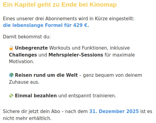 Doch beim Abspulen der virtuellen Kilometer bei kinomap gab es eine Information (allerdings per E-Mail), die sagt, dass es bald kein Lifetime-Abo mehr geben wird. Aus die Maus. Ab dem 31. Dezember 2025 wird das "Lifetime" Abo eingestellt: