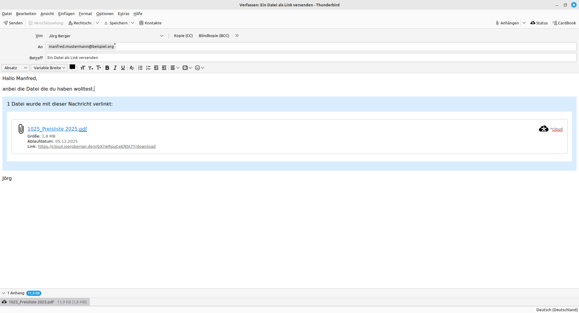 In einer neuen E-Mail kann man nun über "Anhängen > Filelink > *cloud" beliebige Anhänge für eine E-Mail hochladen lassen. Diese werden automatisch in der E-Mail verlinkt!